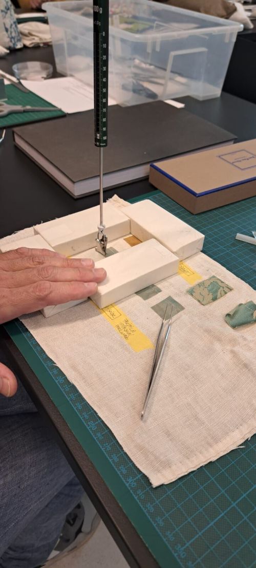 In dem 1 ½ tägigen Workshop wurde die Sicherung von fragilen Seidengeweben mit Klebstoffgittern aus einem Stärkekleister-/Leimgemisch vorgestellt.