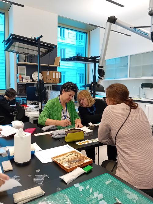 Veranstaltungsort des Workshops war die Werkstatt der Textilrestaurierung des Wien Museums. Der erste Tag startete mit Begrüßungsworten des Direktors des Wien Museums Dr. Matti Bunzl und der Leitung für Restaurierung und Dipl.-Rest. (Univ.) Alexandra Czarnecki sowie einer Vorstellung von der Dipl.-Rest. Julia Dummer. Anschließend gab uns die Vortragende einen Einblick über die Entstehung der Methode und eine erste theoretische Einführung zu den Klebstoffgittern aus einem Stärkekleister-/Leimgemisch. Nach einer kurzen Kaffeepause startete der praktische Teil der Veranstaltung. Ein Stärkekleister-/Leimgemisch aus Reisstärke und Hasenleim sowie ein Agarosegel selbst hergestellt. Das selbst hergestellte Gemisch wurde anschließend in drei Silikonformen mit Gitter- und Wabenstruktur sorgsam eingestrichen. Nach der Mittagspause wurden die von Frau Dipl.-Rest. Julia Dummer vorbereiteten Klebstoffgitter an Testgeweben in drei unterschiedlichen Qualitäten praktisch angewendet. Jeder Teilnehmer hatte somit die Möglichkeit die Methode selbst zu erproben.